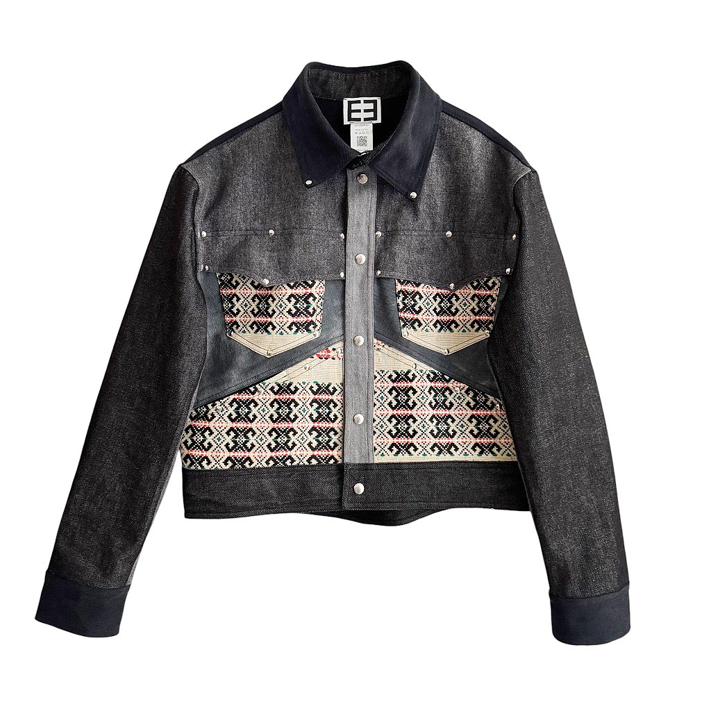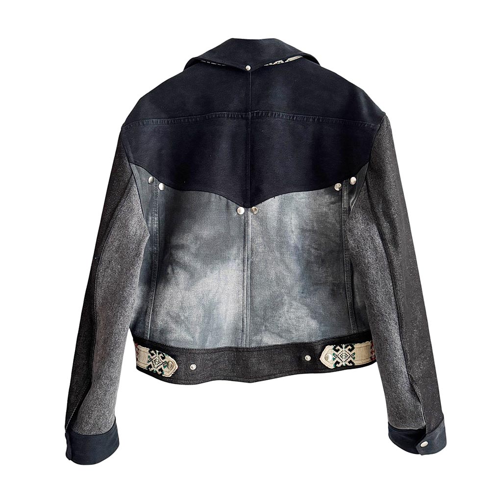 Vegas Jacket Mix Grey Denims Elephant Paris Design Ce design est réalisé avec des toiles anciennes noires et grises, dont certaines délavées, de jeans Levis 501 des années 1 9 8 0, et une toile de coton mélangée tissée, 1 0 0 % coton, les finitions sont gansées au biais de coton noir Cette pièce unique est entièrement fabriquée à Paris, les rivets et les pressions sont en métal argenté, fabriquées en Italie et posées à la main à Paris Mesures prises à plat : Epaules : 5 2 c m, Poitrine : 6 0 c m, Longueur dos :…