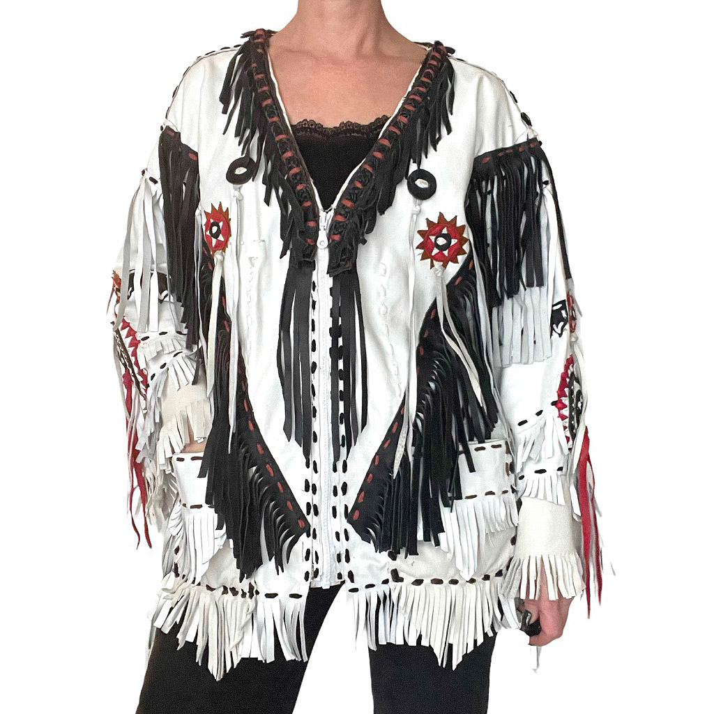 Veste artisanale Indienne en cuir et daim à franges blanche Elephant Paris Vintage années 80, neuve d’époque, cousue et coupée main Mesures à plat : Epaules 54cm, Poitrine 54cm, Longueur dos 73cm, Taille 40