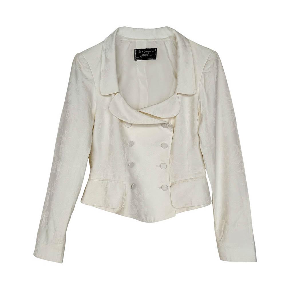 Veste coton Lolita Lempicka premiere Elephant Paris Vintage Années 80, couleur blanc cassé, coton épais damassé, viscose et rayonne pour la doublure, boutonnage et décolleté style Victorien, boutonnage poignets, taille marquée Mesures à plat : Epaules 38cm, Poitrine 44cm, Taille 35cm, Longueur dos 52cm, Taille S Bon état