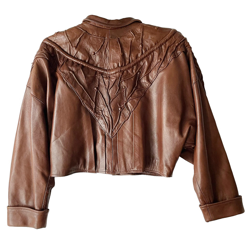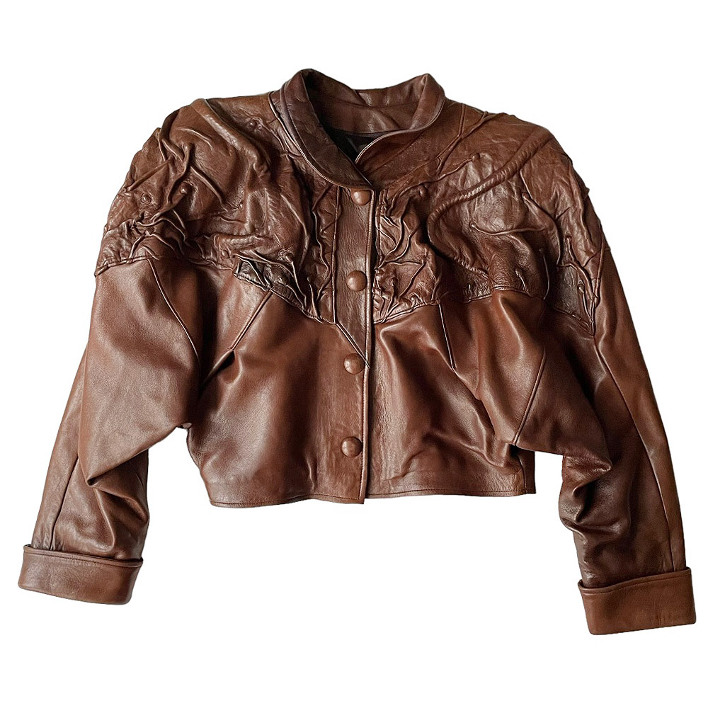 Veste en cuir souple courte années 80s, neuve d’époque, manches chauve-souris, taille 38, boutonnage devant par pressions Elephant Paris Vintage Longueur dos 48cm
