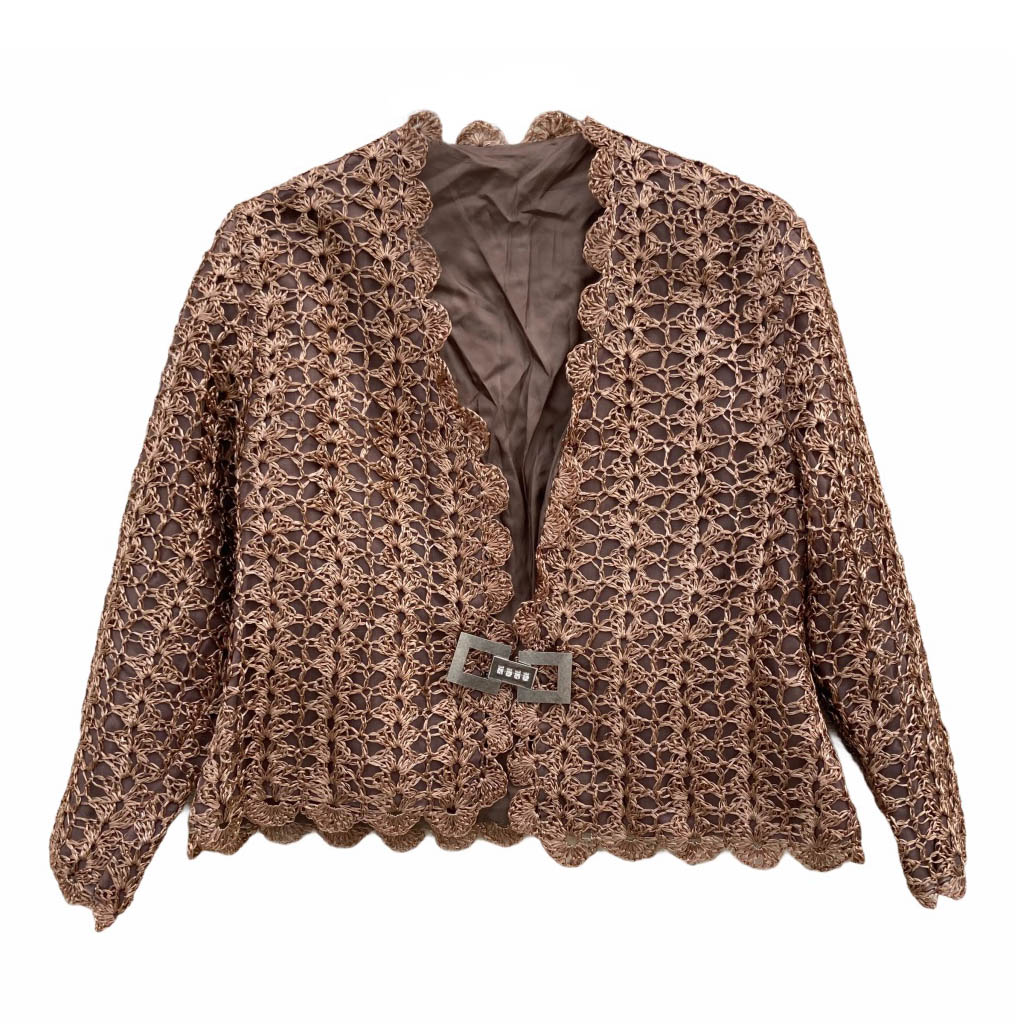 Veste en raphia doublée et fermée par une agrafe bijoux en métal argenté et strass Elephant Paris vintage