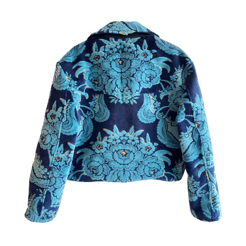 Veste tapisserie Vegas set bleu Elephant Paris Design réalisé avec des matériaux anciens, velours rigide ameublement années 70, Pièce unique Made in France Mesures à plat : Epaules 47cm, Poitrine 54cm, Taille 46cm, Longueur dos sans le col 59cm, Taille 50 M/L