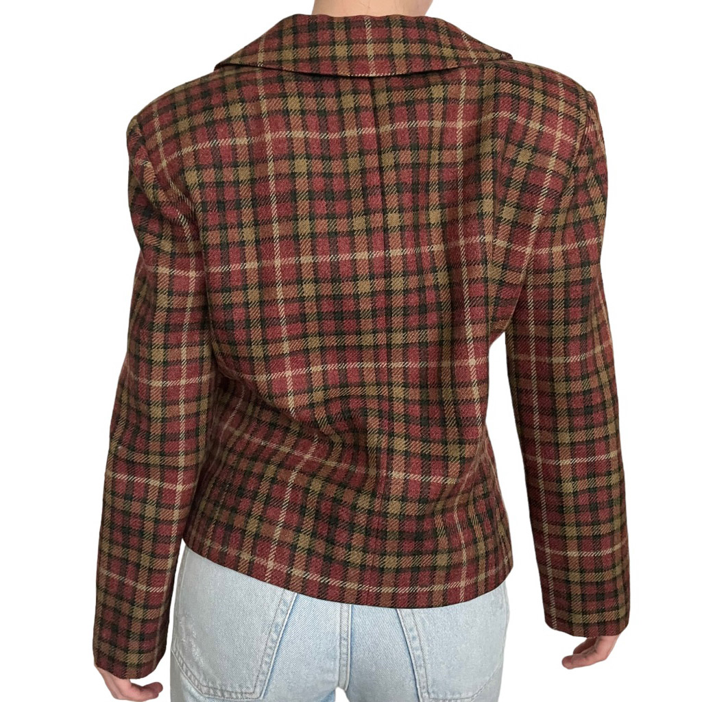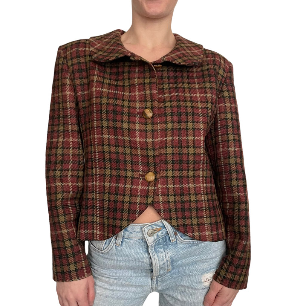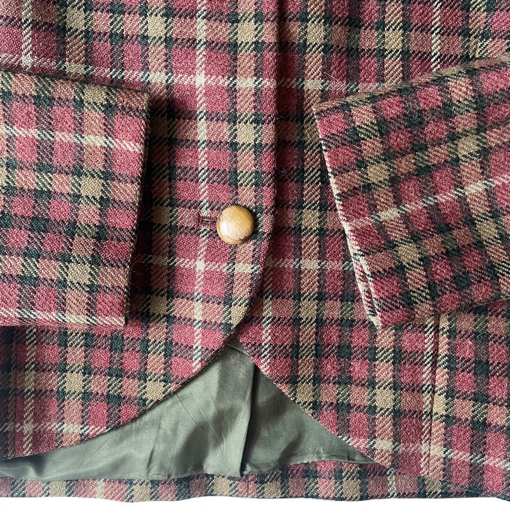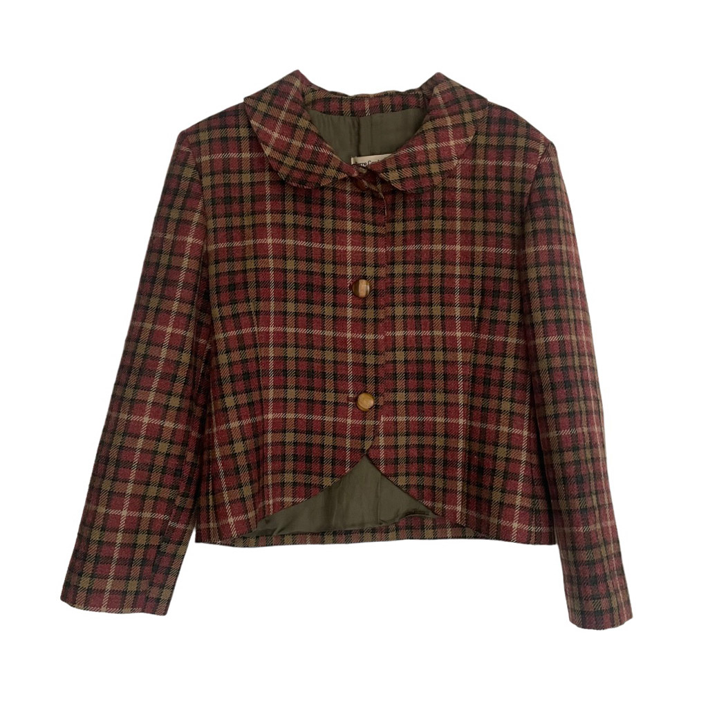 Mini veste tartan Pierre Cardin Elephant Paris Vintage légèrement cintrée, doublée, 3 boutons devant, col Claudine, Taille S/M Laine, lainage Mesures à plat : Epaules 45cm, Poitrine 50cm, Longueur dos 56cm, Taille globale 38