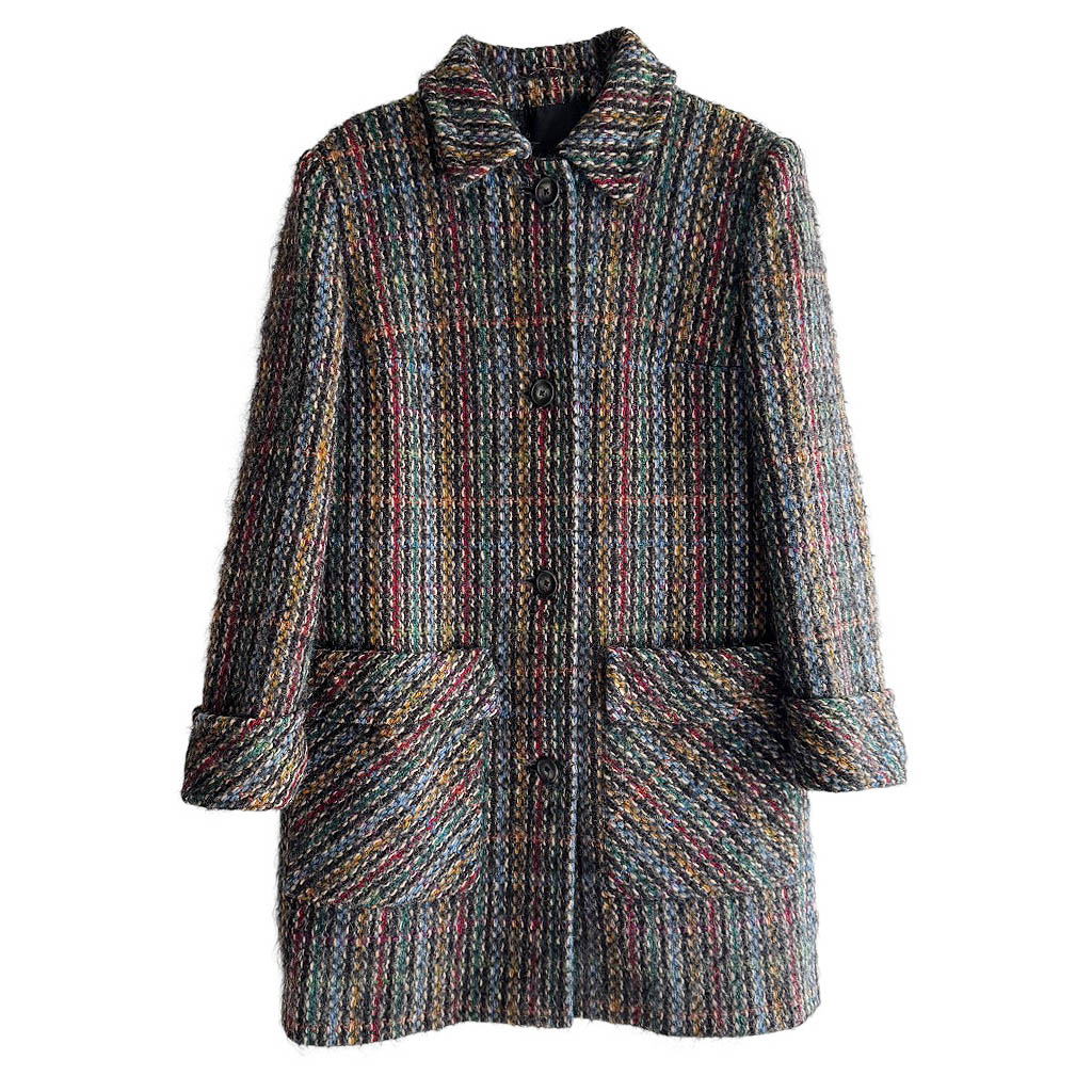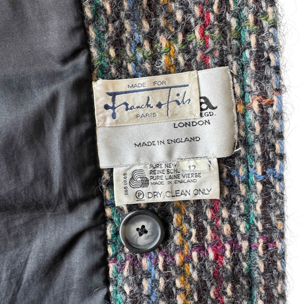 Veste tweed Franck et Fils London Elephant Paris Vintage Deréta REGD London, Made in England for Franck et Fils, Années 80, 100 % pure laine vierge, Coupe droite, pli creux dans le bas du dos, grande martinguale, poignets à revert, poches plaquées Mesures prises à plat : Epaules 42 cm, Poitrine 52 cm, Longueur dos avec le col 92 cm, Longueur manche 60 cm, Taille M / L