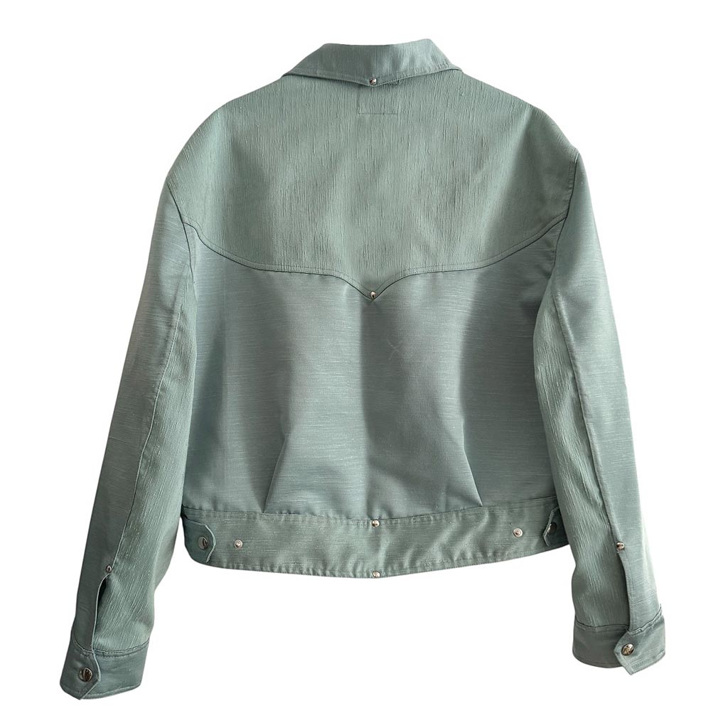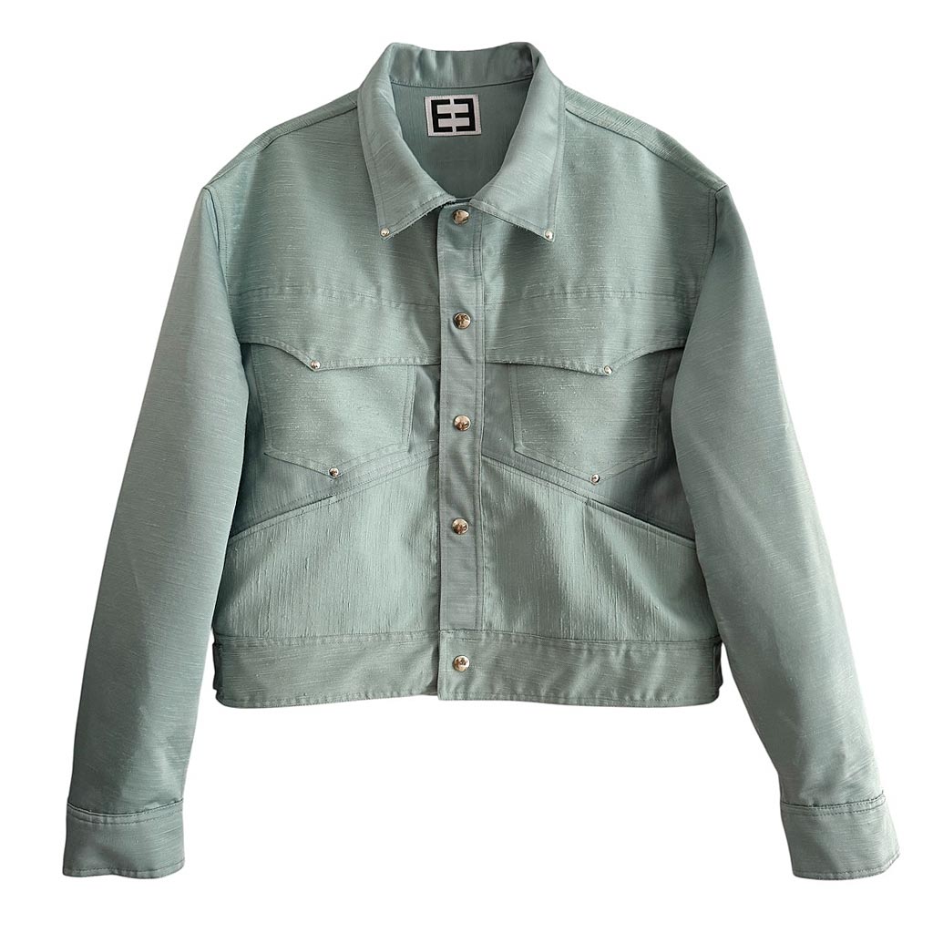 Veste Vegas Satin Denim Pastel T 58 Elephant Paris Design Design réalisé avec une toile ancienne d’ameublement des années 1 9 7 0, satin épais avec un côté mat strié et un côté brillant lisse, finitions gansées au biais de coton beige. Pièce unique made in Paris, rivets et pressions made in Italy et posés à la main à Paris Mesures prises à plat : Epaules : 4 8 c m, Poitrine : 0 0 c m, taille : 0 0 c m, Longueur dos : 0 0 c m
