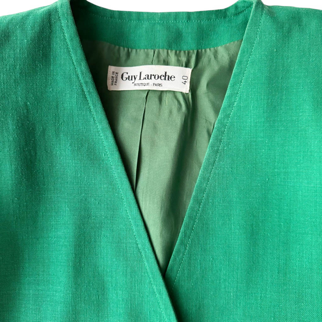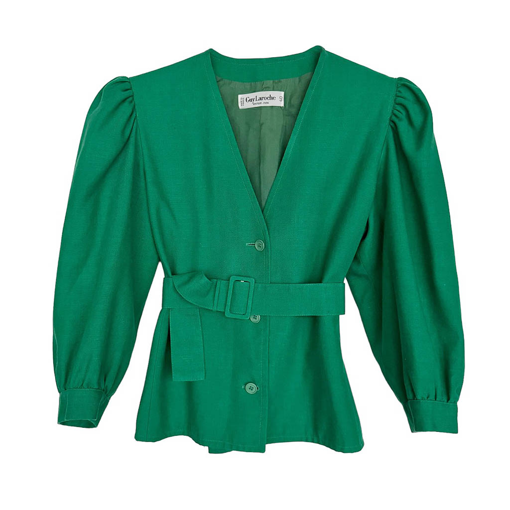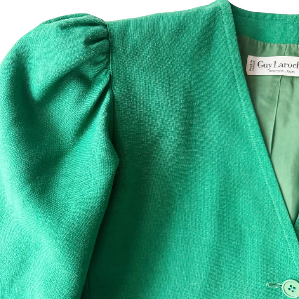 Veste verte coton Guy Laroche Elephant Paris Vintage Années 80, coton, Mesures à plat : Epaules 32cm, Poitrine 49cm, Taille 40cm, Longueur dos 109cm, Taille 38/40
