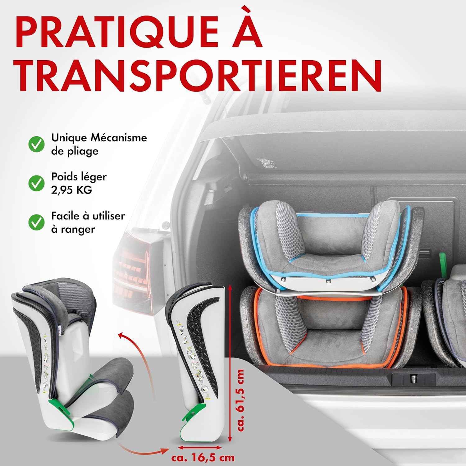 En termes de confort, le WALSER Premium Noemi ne fait aucun compromis. Son rembourrage doux et agréable est idéal pour les longs trajets, et les guides de ceinture pratiques évitent tout inconfort. De plus, son poids léger de 2,95 kg et son système de pliage unique permettent un transport facile et un rangement compact. La housse, facilement amovible et lavable à 30 degrés, simplifie l’entretien, garantissant ainsi un siège toujours propre et accueillant pour votre enfant.