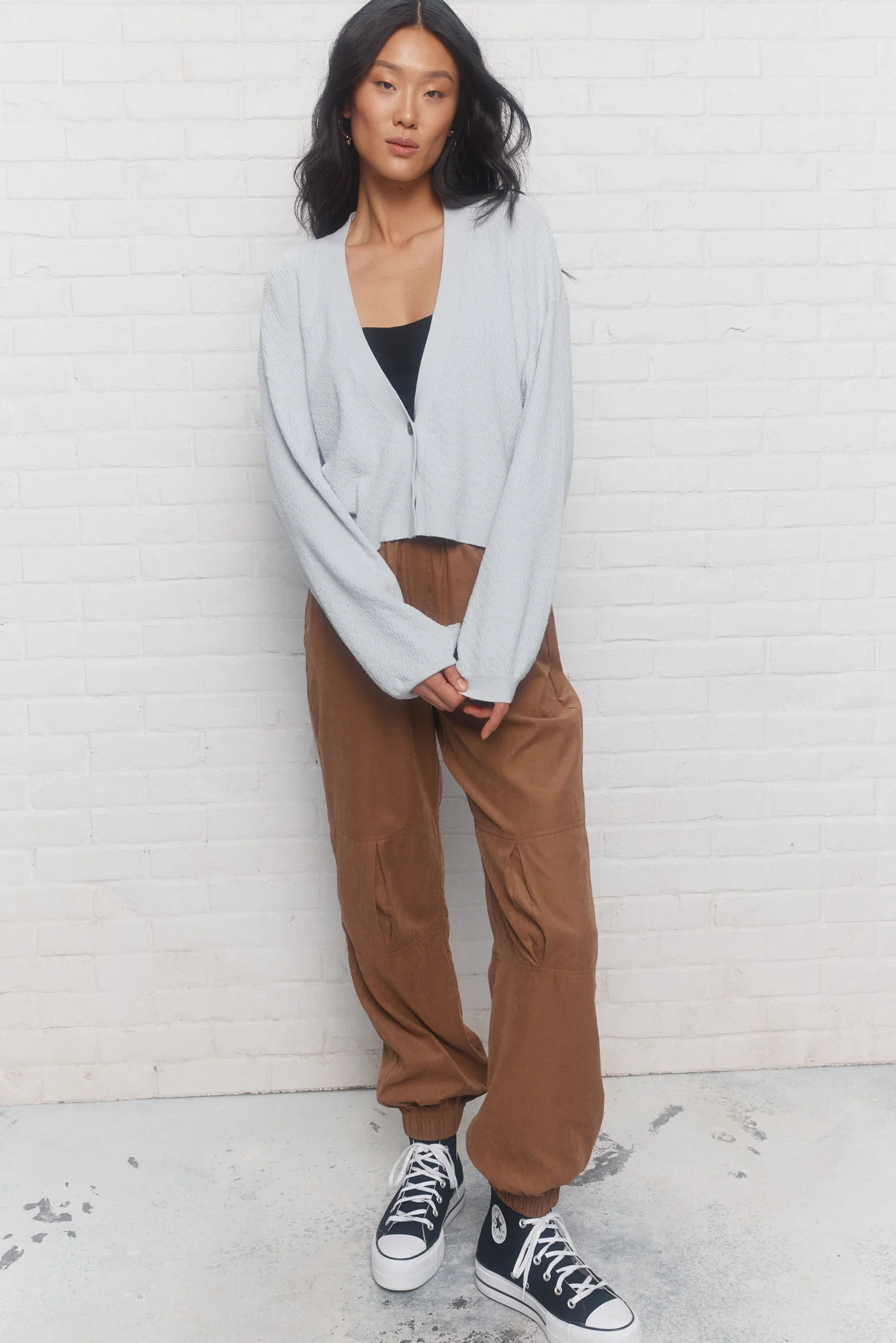 – L’ensemble conseillé par les stylistes JOELLE : le pantalon brun ajusté aux chevilles Weekai, le bustier Hush et la veste Briar pour un total look.