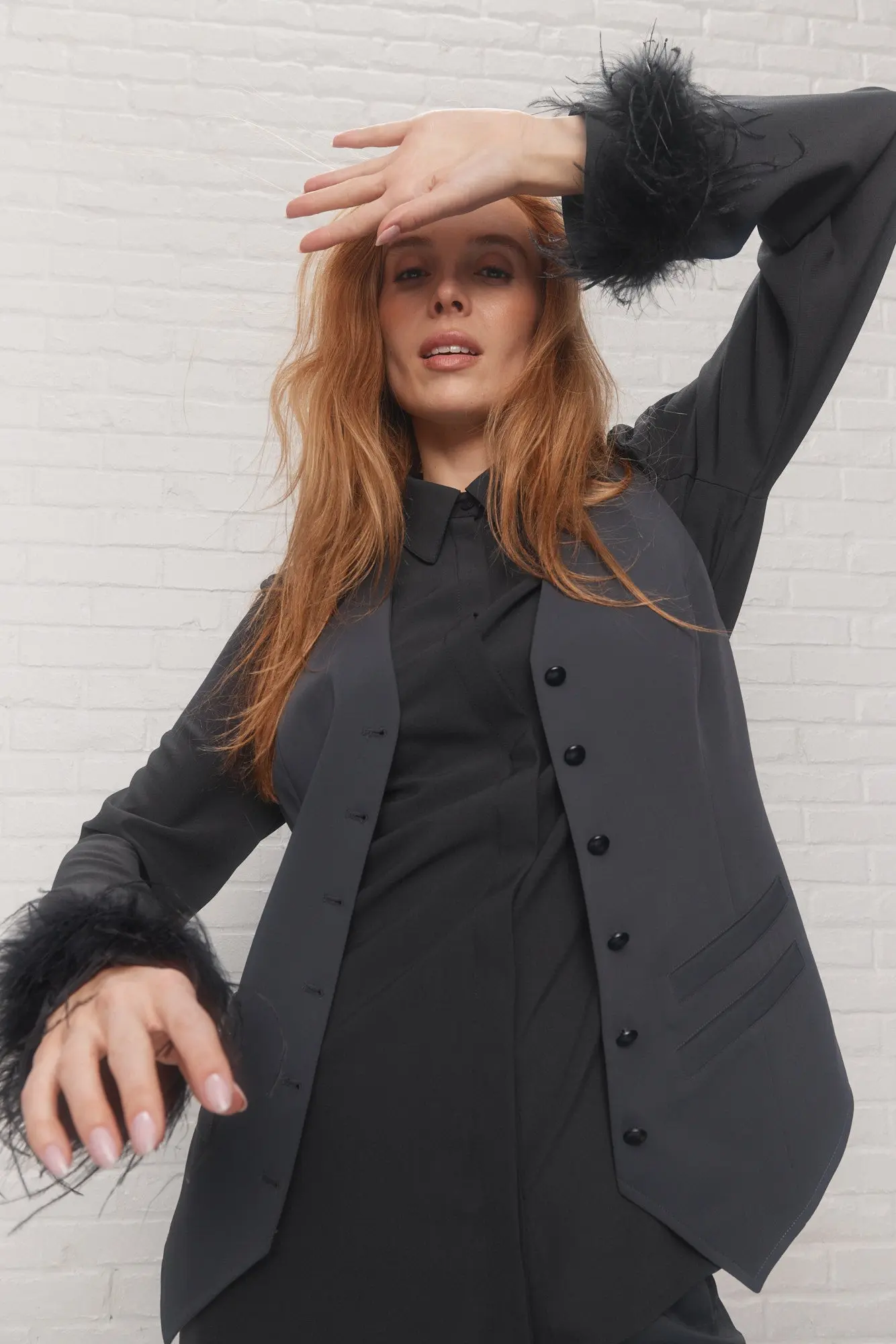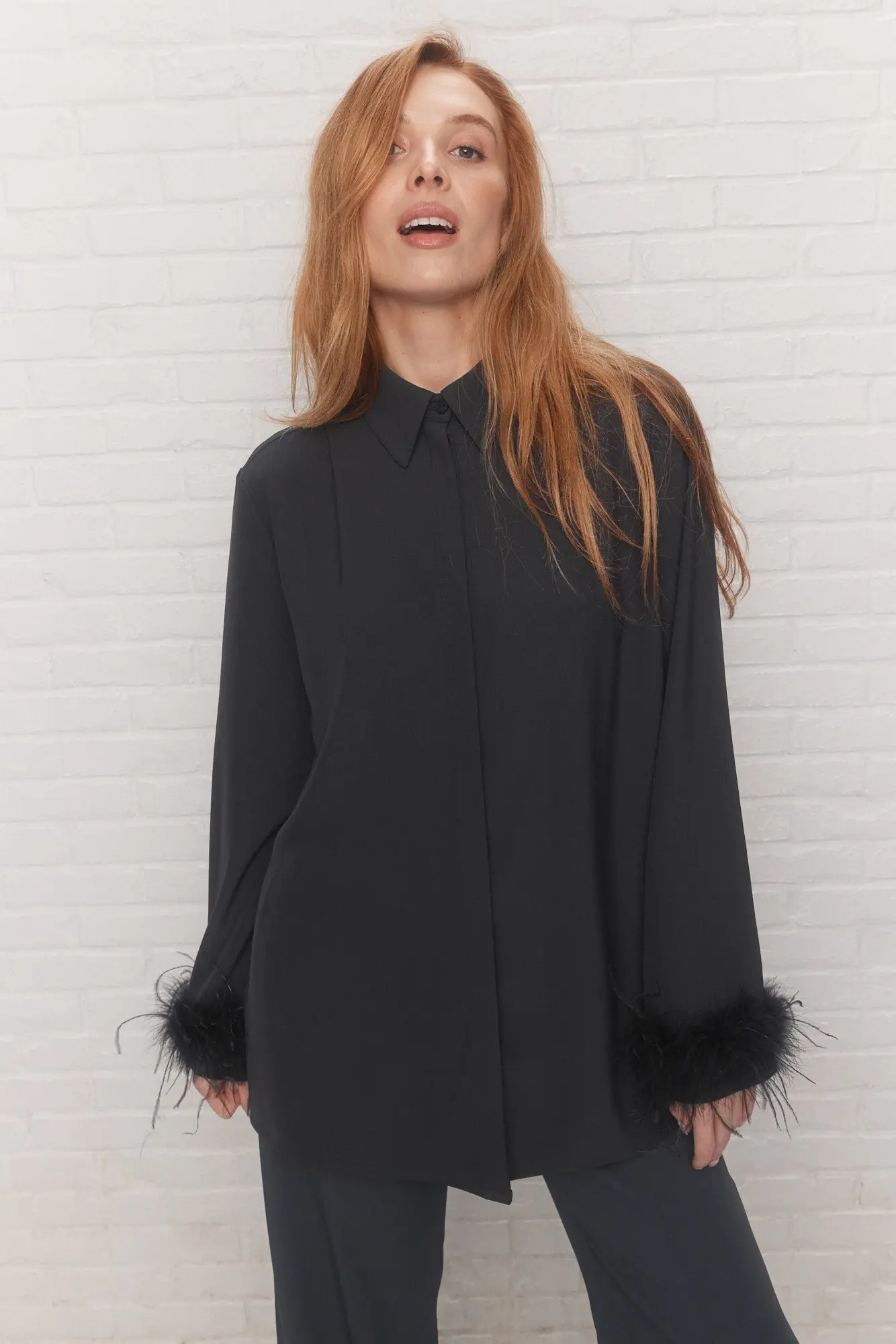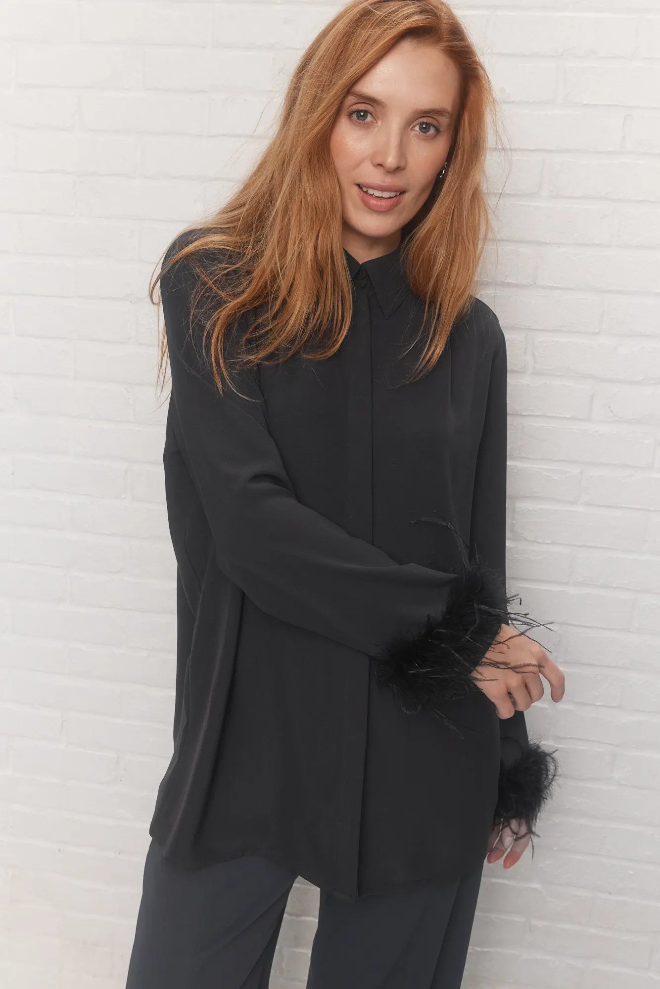- Manches longues droites avec empiècement aux poignets et bande de fausses plumes amovible